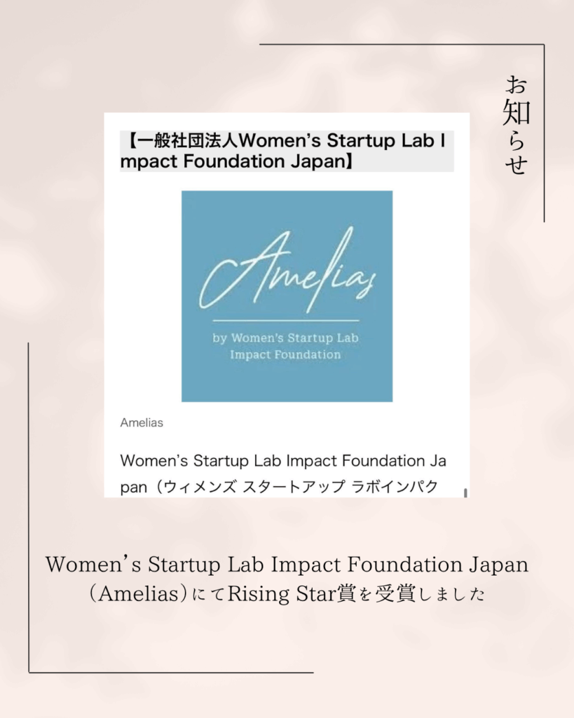 【お知らせ】Women’s Startup Lab Impact Foundation Japan(Amelias)にてRising Star賞を受賞しました 続きを読む »