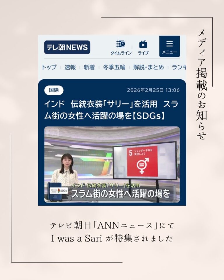 テレビ朝日「ANNニュース」good on you「Shift C」J-POWER(電源開発株式会社)「GLOBAL EDGE」東京都「TOKYOエシカル」モノマガジンJ-WAVEOneNews / Yahoo!ニュース起業時代週刊エコノミストTABI LABOFM愛知「Brother Presents Earth Music」『地球の歩き方 インド』2024年~2025年度版エコチルニューズウィーク日本版and more… 【メディア掲載】2026/02/27 テレビ朝日「ANNニュース」でI was a Sari が特集されました。先日放映された番組では、ムンバイの工房で働く女性たちの姿や廃棄ではなく「再生」を選ぶコンセプトが丁寧に映し出されました。I was a Sariとは役目を終えたサリーを一枚ずつ素材として再生し、それぞれの物語をまとうプロダクトへと生まれ変わらせるブランドです。 番組では、・ムンバイの工房での手仕事・鎌倉「えしかる屋」様での取材・東京でのポップアップの様子・お客様の声 なども紹介されました。▼こちらから映像でご覧いただけます。https://x.gd/Y6iLm このような形で取り上げていただけたこと、関わってくださったすべての方々、そして応援してくださるみなさまへ、心より感謝申し上げます。 【メディア掲載】2025/04/02 株式会社VOIX・合同会社bluu・ダイレクトマーケティング株式会社が運営するウェブメディア「VOXI」に記事を掲載していただきました。エシカリージャパンが贈るサリーで日本とインドの女性たちを笑顔にする夢の実現についてお伝えしています。記事はこちらからご覧ください。 【メディア掲載】2025/03/19 株式会社VOIX・合同会社bluu・ダイレクトマーケティング株式会社が運営するウェブメディア「VOXI」に記事を掲載していただきました。エシカリージャパンがインドネシアのブランド「TORAJAMELO」「AHANA」を日本市場で展開する意義をお伝えしています。記事はこちらからご覧ください。 【メディア掲載】2025/03/13 good on youが運営するウェブメディア「Shift C」にエシカリージャパンのオリジナルブランド < never leather > が取り上げられました。記事はこちらからご覧ください。 【インタビュー記事掲載】2024/10/17 J-POWER(電源開発株式会社)の広報誌「GLOBAL EDGE(グローバルエッジ)」第79号内の連載「Venus Talk」に記事を掲載していただきました。当社の代表中川が、インド人女性の民族衣装サリーのアップサイクルブランドについてインタビューしていただいています。記事はこちらからご覧ください。 【インタビュー記事掲載】2024/10/08 東京都が推進する『TOKYOエシカル』に記事を掲載していただきました。当社の代表中川がエシカリージャパンを起業した背景やビジョンについてインタビューしていただいています。記事はこちらからご覧ください。当社は東京都が推進するアクション「TOKYOエシカル」のパートナー企業です。 【雑誌掲載】2024/05/31 「モノ・マガジン」2024年6月16日号に、エシカリージャパンのオリジナルブランド < never leather > をP126-127の見開き『BOOK IN BOOK “mono shop magazine”!!!』にて取り上げていただきました。詳しくはこちらから、ぜひご覧ください。なお、モノマガジンのオンラインショップ『mono shop』にてピックアップしていただいております。ぜひこちらからご覧ください。 【ラジオ出演】2024/03/24 JWAVEのラジオ番組「J-WAVE SELECTION ITOCHU DEAR LIFE,DEAR FUTURE」にエシカリージャパン代表の中川が出演しました。ナビゲーターのSHELLYさんとともに「私たちの生活、未来のために、明日からすぐ行動できる身近なアクションのきっかけを作る」をテーマに、ココナッツウォーター由来のオリジナルブランド「 never leather 」について語りました。詳しくはこちらをご覧ください。アーカイブはPodcastからもお聴きいただけます。(15:00ごろ~) 【雑誌掲載】2024/03/12 「モノ・マガジン」2024年3月16日号に、エシカリージャパンのオリジナルブランド < never leather > が取り上げられました。「特集 植物道楽」~新製品から時代を読む~ の中で【グリーン×リサイクル】のアイテムとしてご注目いただいています。詳しくはこちらから、P69をぜひご覧ください。 【メディア掲載】2024/02/09 株式会社KADOKAWAが運営するウェブメディア「One News」にエシカリージャパンのオリジナルブランド < never leather > が取り上げられました。こちらはYahoo Newsにも掲載され、反響をいただいております。記事はこちらからご覧ください。 【メディア掲載】2024/02/05 統合型経営プラットフォームを展開するfreee株式会社が発行する雑誌「起業時代」(Vo.04)にエシカリージャパン代表の中川がインタビューされました。動画はこちらからご覧いただけます。 【雑誌掲載】2024/01/15 毎日新聞社出版「週刊エコノミスト」1月23日・30日合併号の「ECONOMIST SELECTION」にエシカリージャパンが取り上げられました。詳しくはこちらをご覧ください。 【メディア掲載】2024/01/03 世界中の新たな価値観を伝える人気ウェブメディア「TABI LABO」に、廃棄ココナッツウォーターからできたオリジナルブランド「never leather (ネバーレザー)」を取り上げていただきました。記事はこちら
